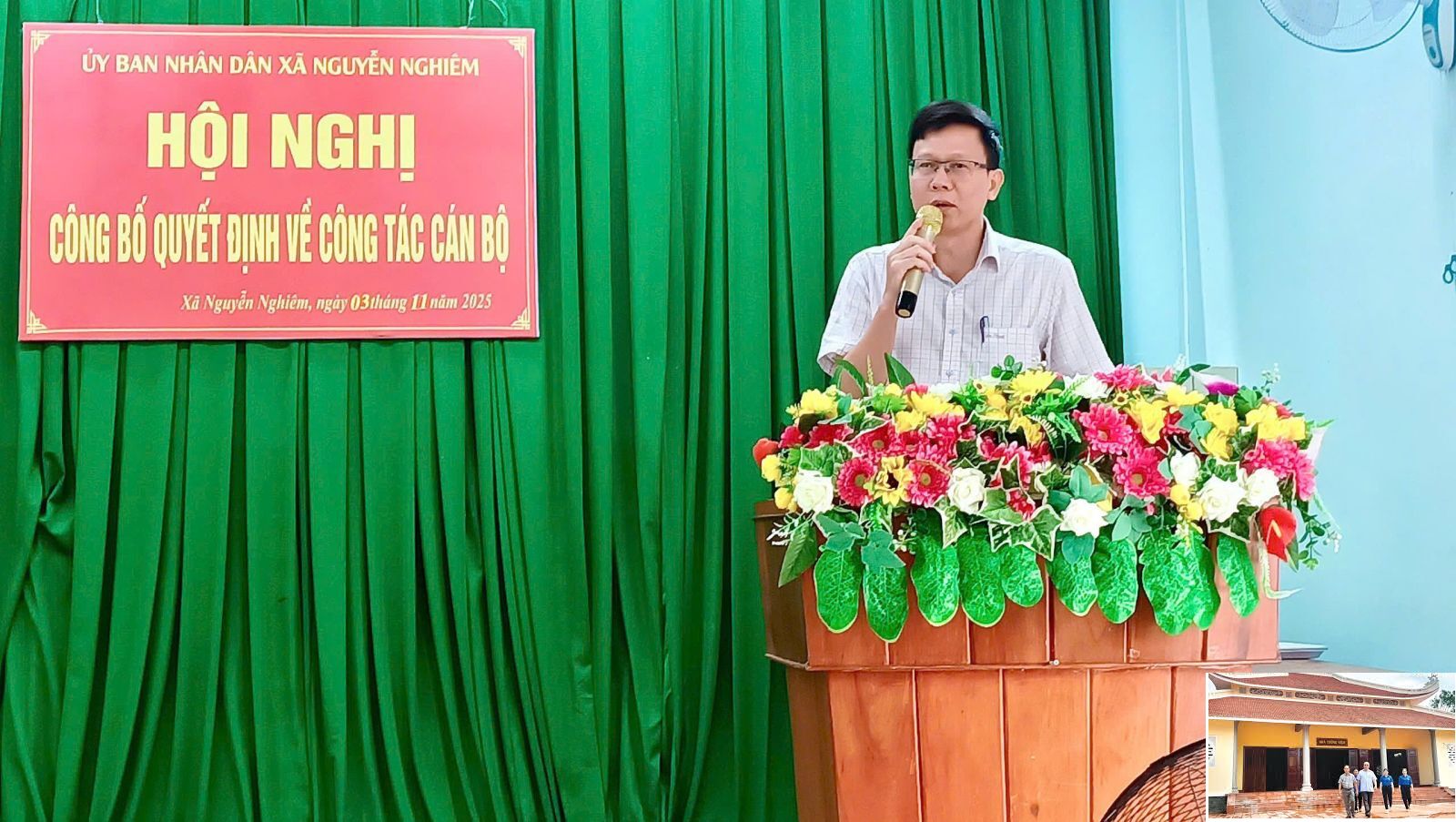 Sáng ngày 03/11/2025, UBND Xã Nguyễn Nghiêm tổ chức Hội nghị công bố Quyết định về công tác cán bộ. Tham dự hội nghị có đồng chí Nguyễn Thịnh - Bí thư Đảng ủy, Chủ tịch HĐND xã; đồng chí Phạm Thị Lê Dung - Phó Bí thư Thường trực Đảng ủy; đồng chí Nguyễn Trung Trực - Phó Bí thư Đảng ủy, Chủ tịch UBND xã; các đồng chí Phó Chủ tịch UBND xã; lãnh đạo Ban Xây dựng Đảng, Ủy ban Kiểm tra Đảng ủy; lãnh đạo, công chức, người hoạt động không chuyên trách các cơ quan: Văn phòng Đảng ủy, Văn phòng HĐND và UBND, Phòng Văn hóa - Xã hội, Phòng Kinh tế và viên chức Trung tâm Cung ứng Dịch vụ công Xã Nguyễn Nghiêm.